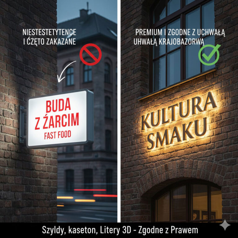 Uchwała krajobrazowa to lokalny akt prawny, który daje gminom prawo do regulowania zasad sytuowania obiektów małej architektury, tablic reklamowych i urządzeń reklamowych. Wprowadzenie tych przepisów w miastach takich jak Warszawa, Kraków, Gdańsk czy Poznań wymusiło na przedsiębiorcach masowe usuwanie nielegalnych nośników. Największym wyzwaniem jest tzw. „okres dostosowawczy” – czas, w którym stare reklamy muszą zniknąć lub zostać wymienione na nowe, zgodne z kodem estetycznym miasta. Ignorowanie tych przepisów grozi karami liczonymi w tysiącach złotych dziennie. Zrozumienie podziału miasta na strefy (np. Stare Miasto vs. Strefa Przemysłowa) jest kluczowe, ponieważ to od lokalizacji zależy, czy Twój szyld może być podświetlany, czy dopuszczalny jest jedynie kaseton o określonych wymiarach.